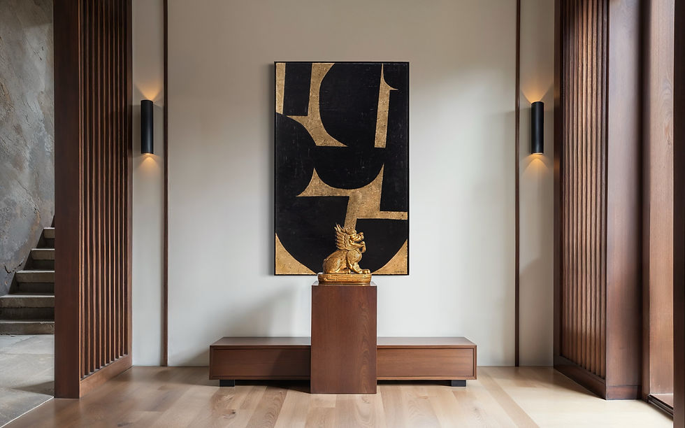 Window of the Soul plays with layering and contrast. Organic forms come together in a structure that evokes depth and movement, while black and metallic gold enhance each other in a powerful interplay.